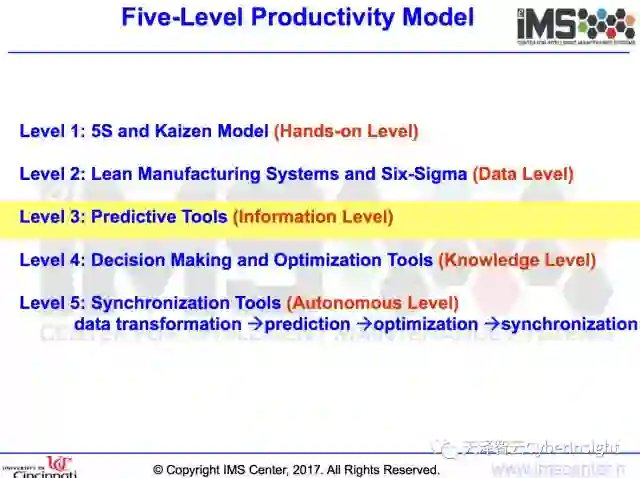 先来讲一下工业的发展历程。很多发展工业的国家首先从提高生产力开始着手。有五个阶段,第一个阶段是全员实践,日语叫Kaizen,中文叫改善。每天做好整理、整顿、清扫、清洁,做整体标准化持续化的改善。第二个阶段是数据化,丰田最早的精益与GE的“6-Sigma”,这是在80、90年代在做的事。第三阶段做预测性建模分析,那时2000年美国在做转型,解决数据层到信息层的问题。第四阶段叫做知识层,现在我们要做的就是把数据变成可以支持决策的系统。第五阶段是最高层,可以自主产生知识、自主决策,不需要管它,比如无人驾驶。但无人驾驶不是目的,无忧驾驶才是,就是说开车时不用担心前面的路况。假如前方一公里处有坑洼,这辆车以前经过此处,通过传感器跟我的GPS建立了关系,下一次我走同样的路线时,还没有开到这个地方,车子就会收到提醒 – 前方一公里处有坑请注意。我的车跟别的车分享,它们还没有开到,也会收到提醒说前面一公里处有坑请注意,这才叫无忧驾驶。这是我们所说的数据的价值转换,从性能优化到避免风险和忧虑。