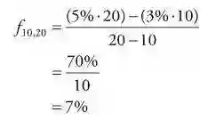假设10年期现汇率s10为3%,20年期现汇率s20为5%。然后10到20的远期汇率是: