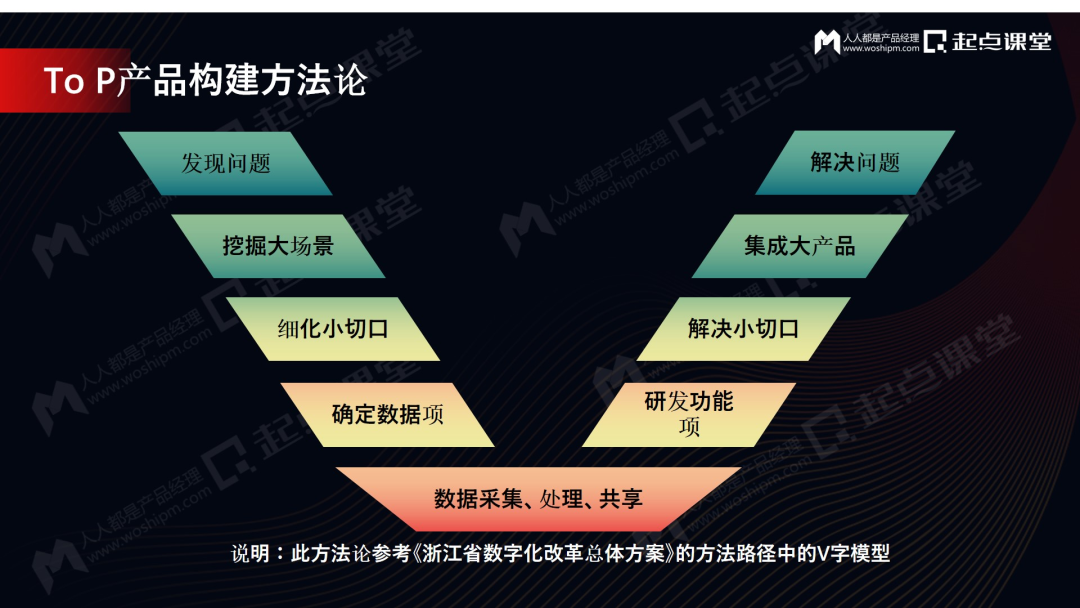 V字模型从发现问题、挖掘大场景、细化小切口,接着到确定数据项,然后研究数据的采集、处理和共享,之后去研发相应的功能项,从而解决小切口,集成大产品,最终解决问题,这是一个非常行之有效的To P产品构建方法论。