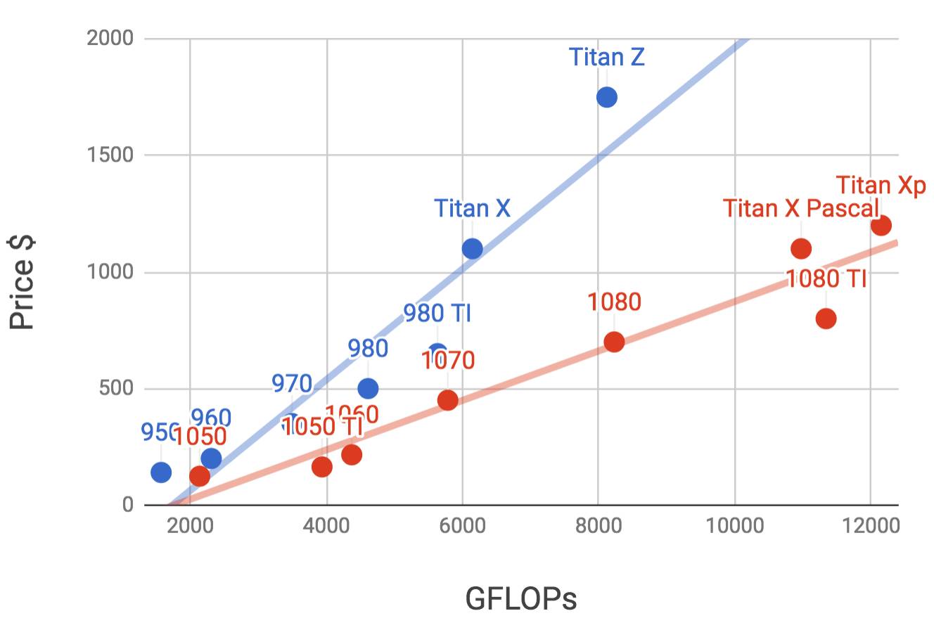 下图画了900和1000系列里各个卡的32位浮点计算能力和价格的对比(价格是wikipedia的推荐价格,真实价格通常会有浮动)。