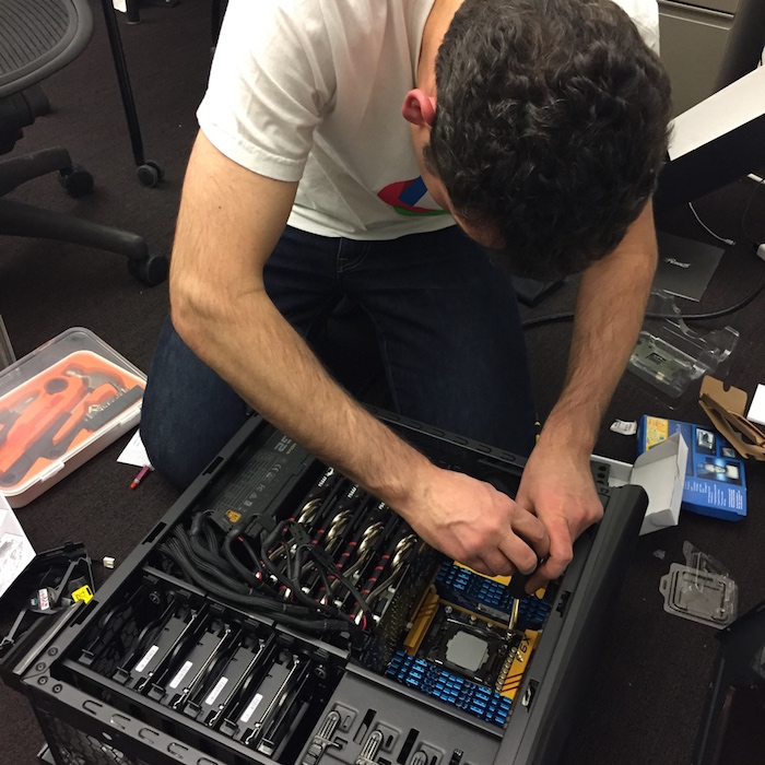 机箱体积。GPU尺寸较大,通常不考虑太小的机箱。而且机箱自带的风扇要好。(下图里我们曾尝试在一个中等机箱里塞满4卡导致散热不好烧了2块GPU。)
