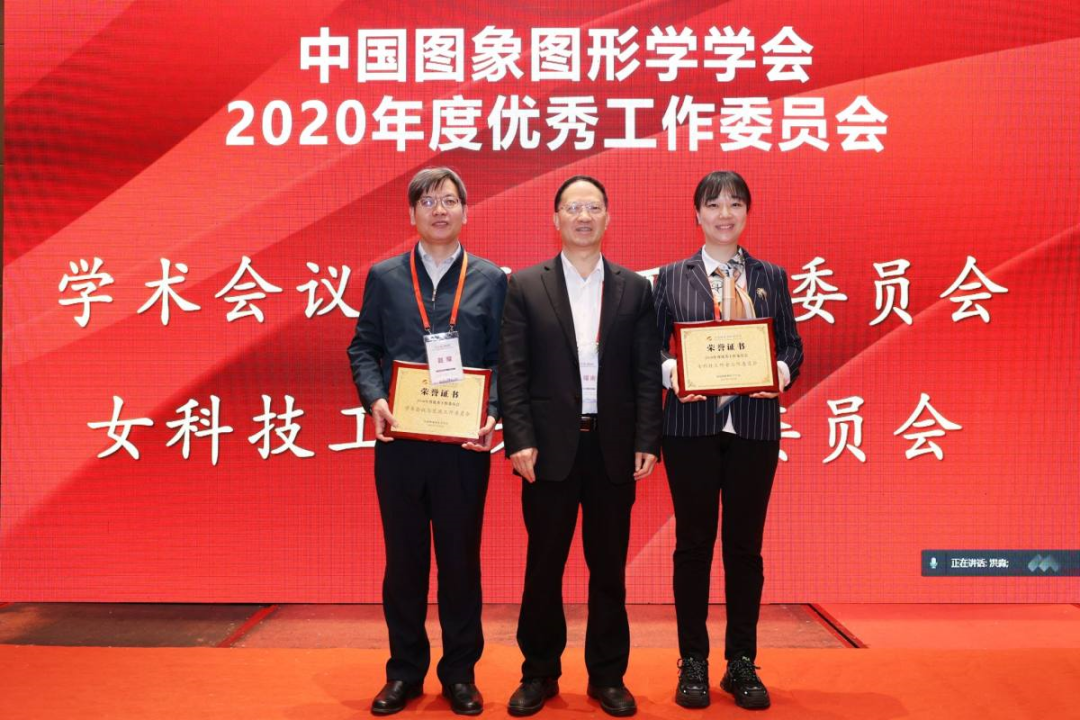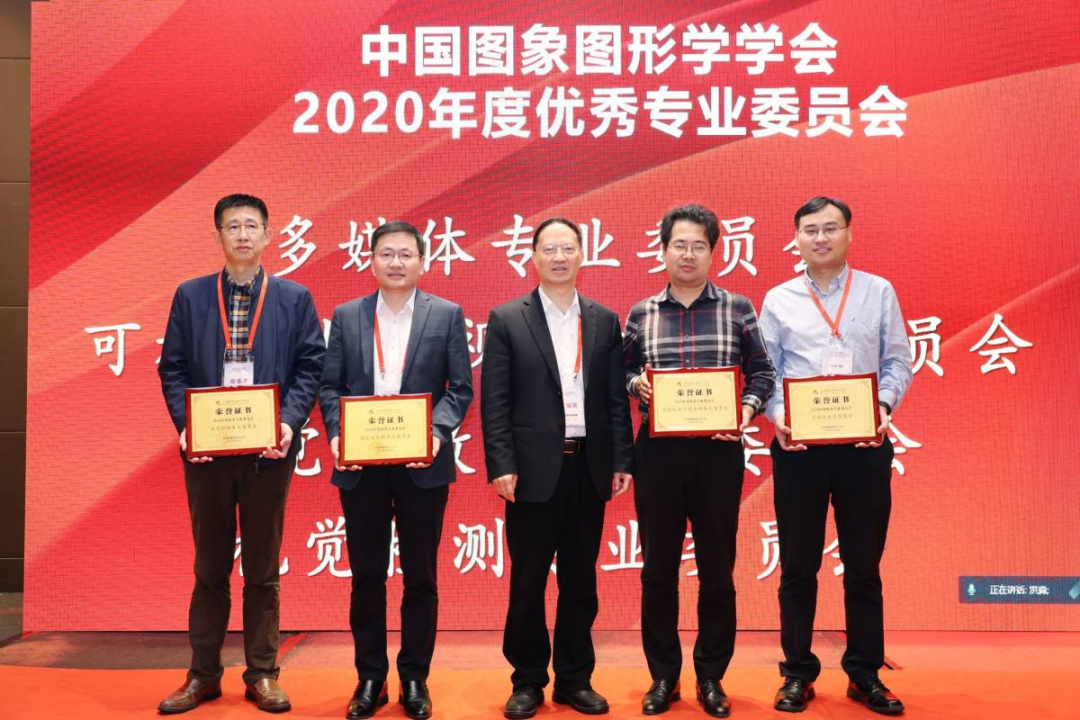 会议上举行了2020年度优秀分支机构颁奖仪式,学术会议与交流工作委员会、女科技工作者工作委员会获得优秀工作委员会荣誉,多媒体专业委员会、可视化与可视分析专业委员会、视觉大数据专业委员会、视觉检测专业委员会获得优秀专业委员会荣誉。王耀南理事长为6个获奖分支机构颁发荣誉证书。