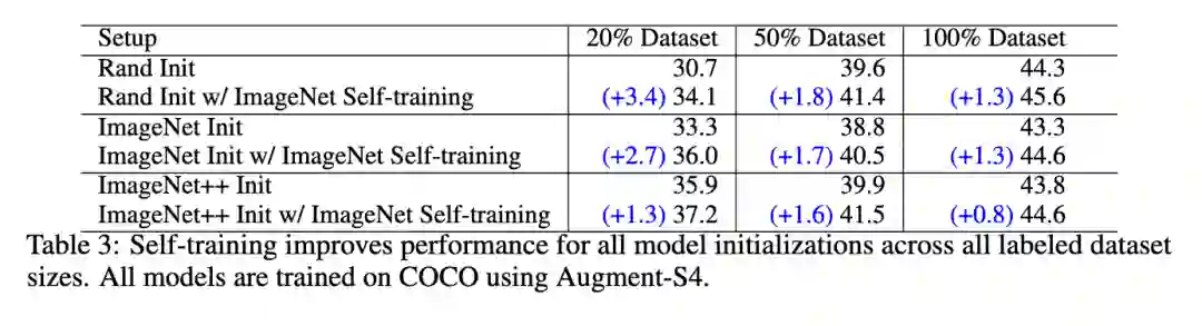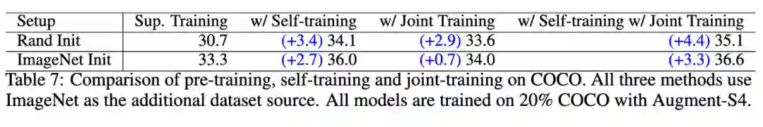 作者在实验中使用了与自训练相同的参数设置,发现ImageNet的预训练可获得+ 2.6AP的增益,但使用随机初始化和联合训练可获得+ 2.9AP的更大增益。而且,预训练、联合训练和自训练都是加性的。使用相同的ImageNet数据集,ImageNet的预训练获得+ 2.6AP的增益,预训练+联合训练再获得+ 0.7AP的增益,而预训练+联合训练+自训练则获得+ 3.3AP的增益。