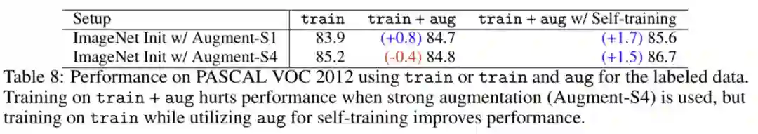 2)借助高强度的数据增强方法(Augment-S4),使用PASCAL(训练+ 增强数据集)进行训练实际上会损害准确率。同时,通过对同一数据集进行自训练而生成的伪标签可提高准确性。
