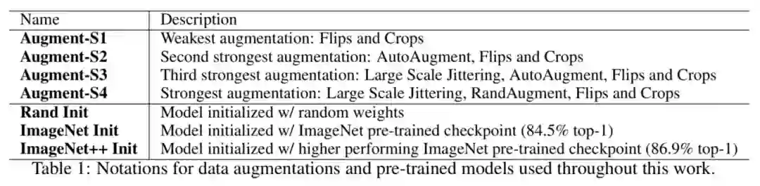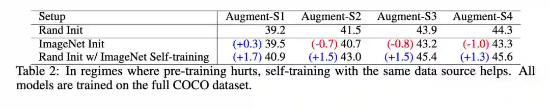 1)使用高强度的数据增强时,监督预训练会损害性能:作者注意到,当他们使用如上所述的标准增强方法Augment-S1时,预训练会对结果有所帮助。但是随着增加增强的强度,预训练并未对结果有太大帮助。实际上,他们观察到,在使用最强的数据增强(Augment-S3)时,预训练会严重损害性能。