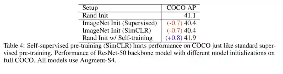 为研究自监督学习的效果,作者使用了完整的COCO数据集和最高强度的增强。目的是将随机初始化与使用了SOTA自监督算法预训练的模型进行比较。在实验中使用SimCLR的检查点,然后在ImageNet上对其进行微调。由于SimCLR仅使用ResNet-50,因此RetinaNet检测器的主干网络用ResNet-50替换。结果如下: