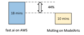 在模型训练部分,ModelArts通过硬件、软件和算法协同优化来实现训练加速。尤其在深度学习模型训练方面,华为将分布式加速层抽象出来,形成一套通用框架——MoXing(“模型”的拼音,意味着一切优化都围绕模型展开)。采用与fast.ai一样的硬件、模型和训练数据,ModelArts可将训练时长可缩短到10分钟,创造了新的记录,为用户节省44%的时间。