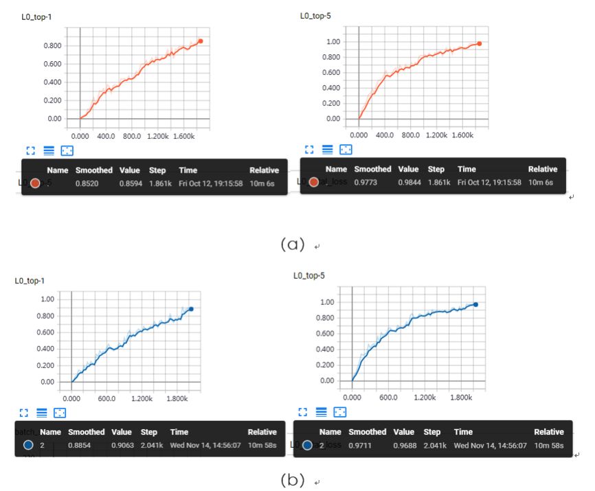 测试的模型训练收敛曲线如下图所示。此处Top-1和Top-5精度为训练集上的精度,为了达到极致的训练速度,训练过程中采用了额外进程对模型进行验证,最终验证精度如表1所示(包含与fast.ai的对比)。图(a)所对应的模型在验证集上Top-1 精度≥75%,训练耗时为10分06秒;图(b)所对应的模型在验证集上Top-5 精度≥93%,训练耗时为10分58秒。