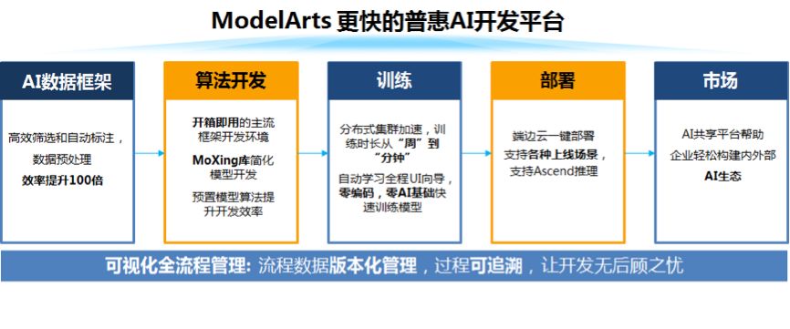 华为云ModelArts是一站式的AI开发平台,已经服务于华为公司内部各大产品线的AI模型开发,几年下来已经积累了跨场景、软硬协同、端云一体等多方位的优化经验。ModelArts提供了自动学习、数据管理、开发管理、训练管理、模型管理、推理服务管理、市场等多个模块化的服务,使得不同层级的用户都能够很快地开发出自己的AI模型。