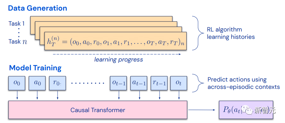 一旦收集完学习历史的数据集,就可以训练一个Transformer来预测之前的学习历史的行动。