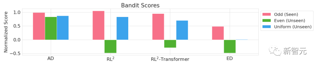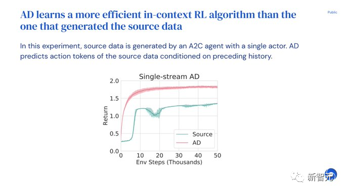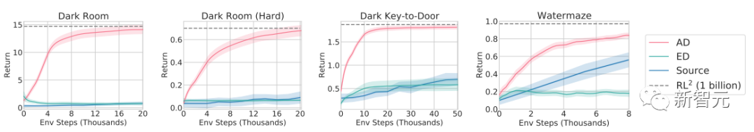AD 可以提取任何 RL 算法,研究人员尝试了 UCB、DQNA2C,一个有趣的发现是,在上下文 RL 算法学习中,AD更有数据效率。