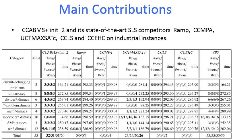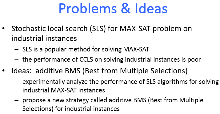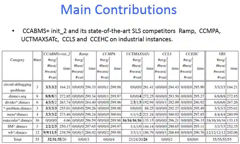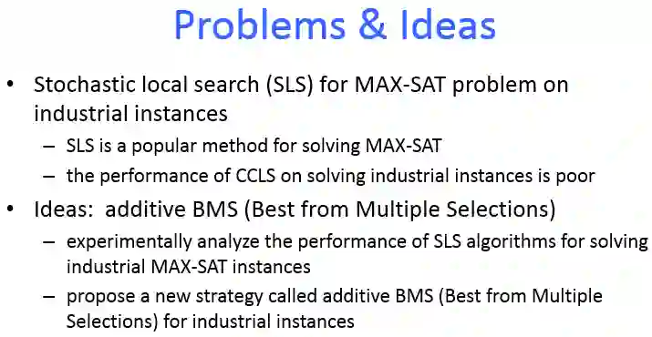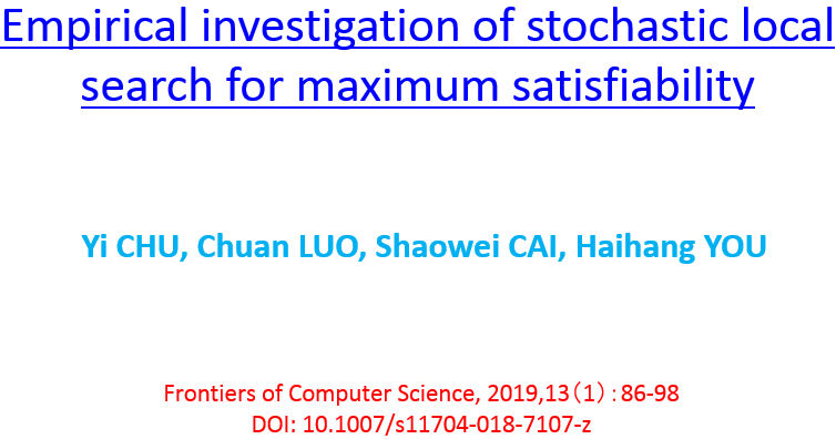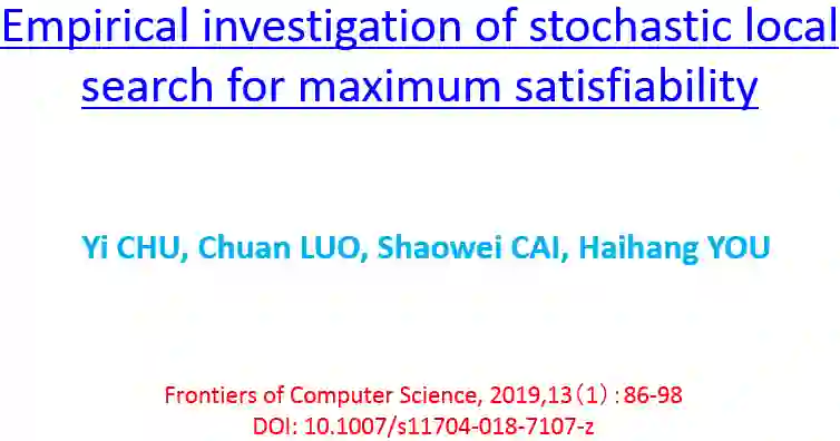 最大可满足性问题(MAX-SAT)在理论上是一个重要的NP难问题,在实践中具有广泛的应用。随机局部搜索(SLS)正成为求解MAX-SAT的一种越来越流行的方法。最近,一个名为CCLS的强大的SLS算法可以高效求解随机实例和手工实例。然而,CCLS在求解工业MAX-SAT实例方面的表现远远落后。本文专注于实验分析SLS算法用于求解工业MAX-SAT实例的性能。首先,进行实验分析CCLS求解工业实例表现不佳的原因。而后,提出了一种名为加性BMS(多种选择中的最佳选择)的新策略以缓解这一严重问题。通过整合CCLS与加性BMS策略,本文开发了一个新的求解MAX-SAT的SLS算法,名为CCABMS,相关实验表明了CCABMS算法的效率。此外,我们通过实验,分析初始化方法对于求解MAX-SAT的SLS算法的效力,并将有效的初始化方法与CCABMS结合,得到一个增强的算法。实验结果表明,对于求解大量工业MAX-SAT实例上的性能,我们的增强算法优于最先进的SLS算法。