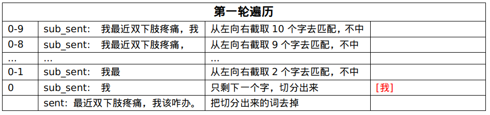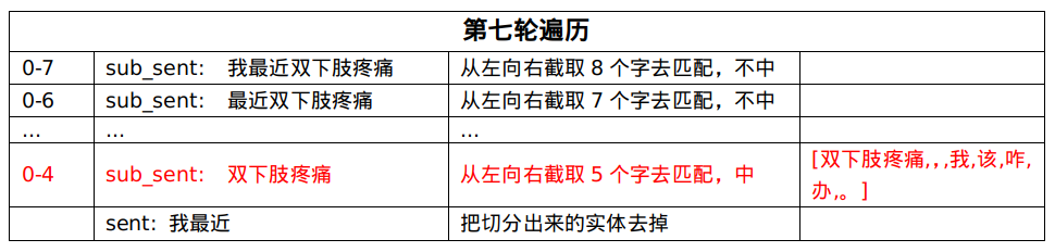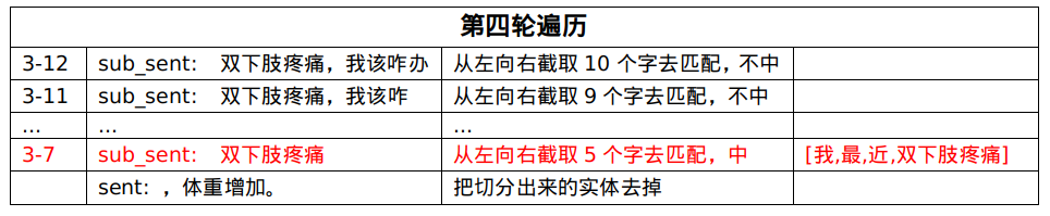 第四轮遍历,匹配中了[双下肢疼痛],就把这个实体从句子中剔除,拿剩下的句子继续匹配。