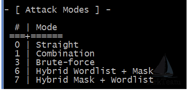 在HashCat中–attack-mode ?参数可以可以指定破解模式,软件一共支持5种破解模式,分别为: