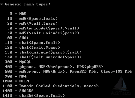 在HashCat–hash-type 参数可以指定要破解的HASH类型,运行hashcat主程序加上–help参数,在* Generic hash types:中可以看到各种HASH类型的代号,如图所示: