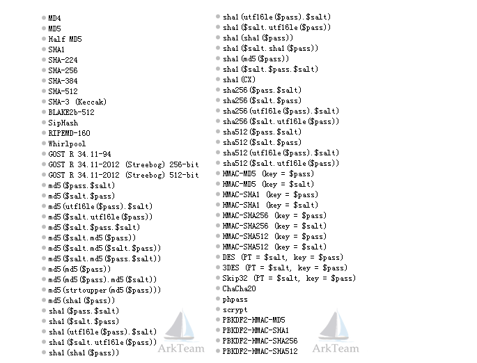 HashCat能够支持加密类型有200多种,且计算速度对于同等开源工具更高,主要的加密算法有下面这些: