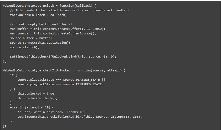 是什么让它变得糟糕透顶呢?是因为苹果公司既没有提供一种利索的解锁音频的方法,也没有提供一种方法来查询 WebAudio Context 是否已经解锁。你所要做的就是播放一个音频源并不断检查是否正在顺序播放。尽管如此,在播放之后你还不能马上检查。是的,你必须等一会!