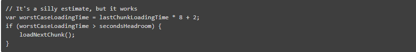 有了这个,你可以在第一个块到达后立即开始播放文件。此外,只有在需要时才会下载更多的块。如果有人只观看视频的前几秒,那么只有前几秒数据才会被下载。JSMpeg 通过测量加载块所花费的时间来实现这一点,添加了大量的安全边界,并将其与已加载的块的剩余持续时间进行比较。