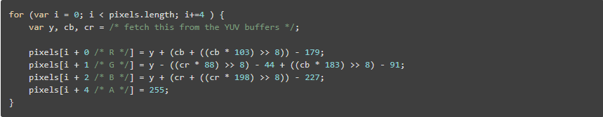 对于单个1280x720视频帧,该循环必须执行921600次以将所有像素从YUV转换为RGBA。每个像素需要对目标RGB数组写入3次(我们可以预先填充alpha组件,因为它始终是255)。