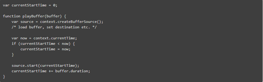 你只需计算下一个缓冲区的开始时间,就可以连续添加所有之前的缓冲区的时间。总是使用 WebAudio Context 自己的时间来做这件事是很重要的。
