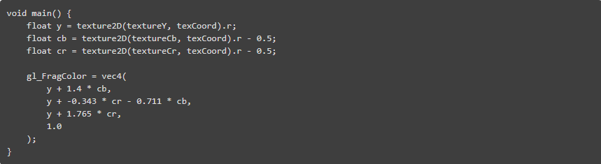MPEG1解码器中计算密集度最高的任务之一是将MPEG内部的YUV格式(准确地说是Y'Cr'Cb)转换为RGBA,以便浏览器可以显示它。简而言之,这个转换看起来像这样: