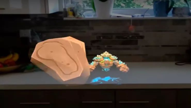 在创建好平面之后,我们看到Dodge会从沙发、地板等不同的点出现,然后,然后向人猛掷石块,还会砸得地面砰砰作响。由于Magic Leap有3D空间音效,所以即使你眼睛并没有注视虚拟物体,音效也会指引你去找到虚拟物体出现的方向。Bryant介绍说Dodge这个Demo只是一个“种子”,开发者可以利用Dodge的教学文件,开发出更好玩的游戏。