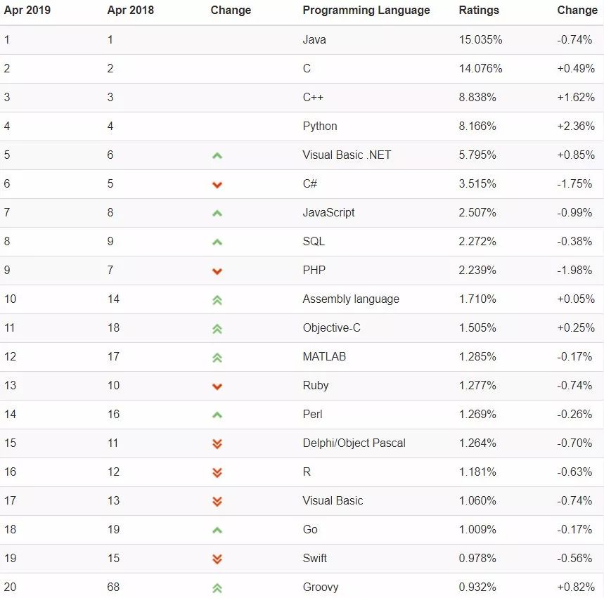 TIOBE 公布了2019年4月编程语言排行榜,总体排名变化不大,排名前十的分别是:Java, C, C++, Python, Visual Basic .NET, C#, JavaScript, SQL, PHP 和汇编语言。本月C语言和C++都强势增长,C语言大有超越Java的趋势,C++则回到第三位置。