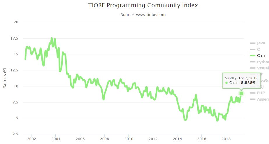 但话说回来,C ++还远远没有达到本世纪初的流行程度,当时它的市场份额超过了15%。当时发布新语言定义C ++ 0x的复杂性和延迟性拉了它的后腿。这种新的语言标准,最终在2011年被命名为C ++ 11,发布的语言版本更加简单,更安全,更具表现力。由于社区必须等待适当的编译器支持,所以在采用C++ 11标准之前又花了几年时间。但是现在最重要的C ++编译器都支持C ++ 11,C ++ 14和C ++ 17标准