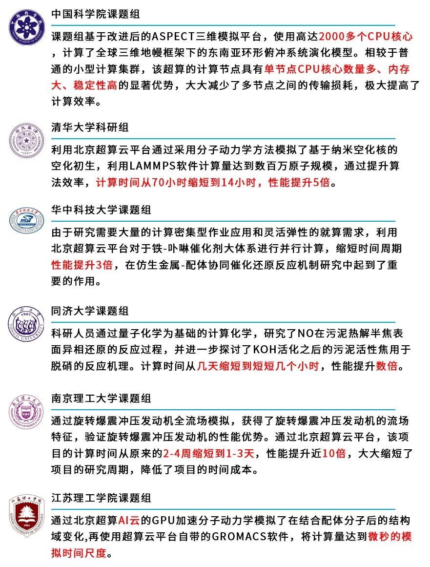 北京超算云平台支持200余种计算相关工具软件(编译器、调试器、并行工具集)和开源科研软件。截至目前,北京超算通用CPU算力超50PFlops,总核心数突破100万核,服务科研用户数超过190,000。
