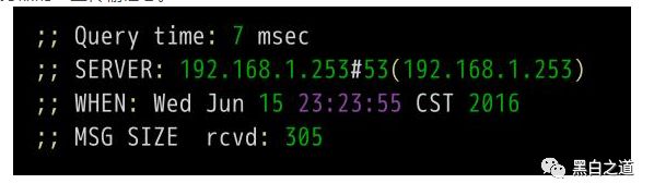 上面结果显示,本机的DNS服务器是192.168.1.253,查询端口是53(DNS服务器的默认端口),以及回应长度是305字节。