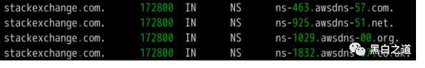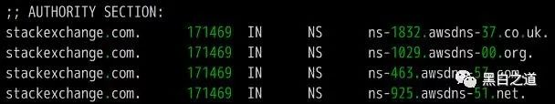 上面结果显示stackexchange.com共有四条NS记录,即四个域名服务器,向其中任一台查询就能知道stackexchange.com的IP地址是什么。