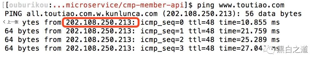 可以在终端命令窗口ping 今日头条官网域名,就可以看到该域名对应的IP地址了。
