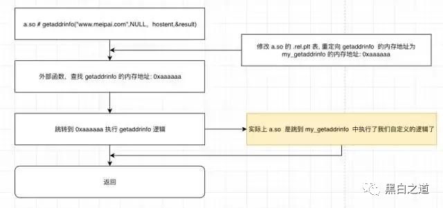 这样,a.so 在实际运行时会被拐到我们的 my_getaddrinfo 中?
