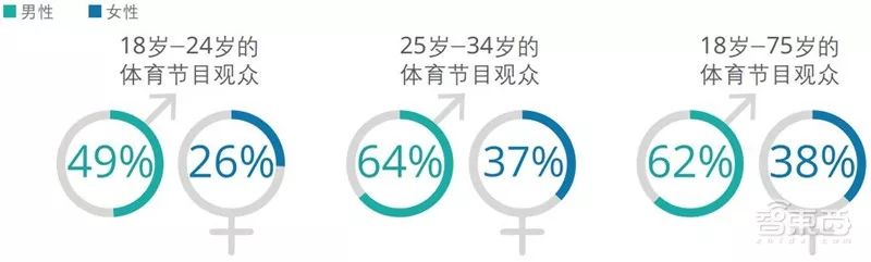 男性通常被认为比女性观看更多的电视体育节目,而我们的研究也证实了这一点。 在美国, 49% 的 18岁至 24 岁美国男性观众 2018 年至少观看一个电视体育节目(包括直播体育节目、 体育脱口秀和精彩集锦), 而同龄女性比例为 26%。 与此相似, 25 岁至34 岁的美国观众中, 64% 的男性观看电视体育节目,女性仅为 37%。