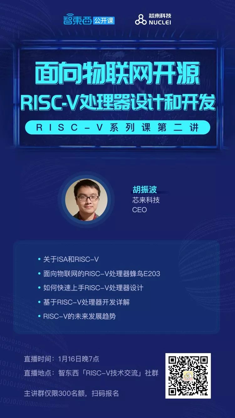 下周三晚7点,RISC-V系列课迎来第二讲,主讲导师为芯来科技CEO胡振波,主题为《面向物联网开源RISC-V处理器设计和开发》。主讲群名额有限,欢迎扫码报名!