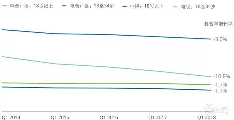 ▲年轻美国人的电视收看率下滑速度是电台广播收听率的三倍