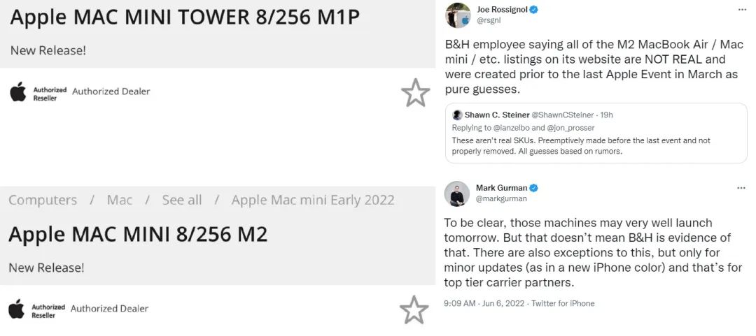 另外在本次发布会之前,有网友在海外的 B&H 上发现了 M2 款 MacBook Air、MacBook Pro 以及 Mac mini、Mac mini tower 的踪迹。不过 B&H 员工今日证实,这些页面在苹果三月发布会之前就已创建,不过纯靠猜测的占位符罢了。古尔曼也有同样看法,但同时强调,新款 MacBook Air 等设备确实会在 WWDC 上亮相。