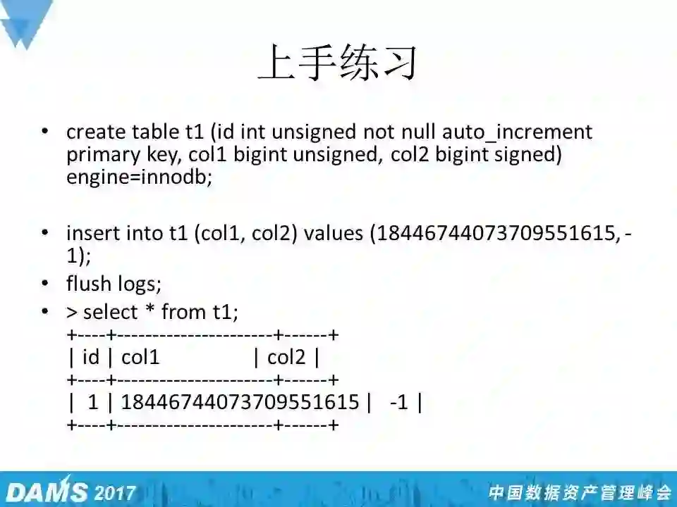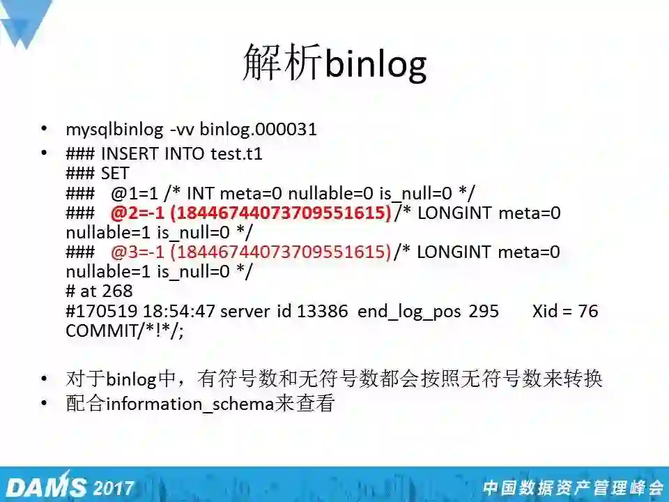 在此我们可以简单做一个小测试,创建一个表,加两个字段,我们把这个最大值和—1都插入进去,会生成一些binlog记录,我们解析binlog,来看看binlog里面是怎么处理的。