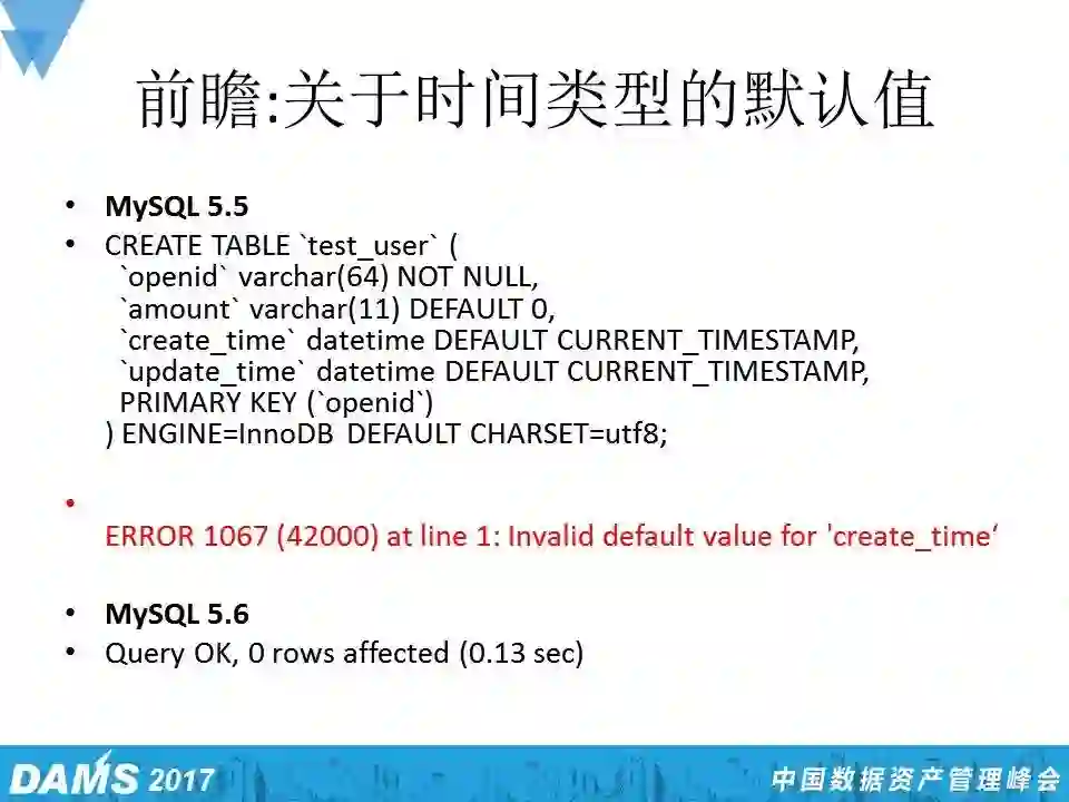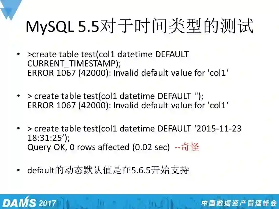 是关于时间类型的默认值的问题。有一个同学提了一个数据变更,他说自己测试没有问题,但是我这边线上环境运行的是有问题的,最后发现他的环境是MySQL 5.5,我是MySQL 5.6,同样的语句下,在MySQL 5.5有问题,MySQL 5.6没问题,显示是时间字段在不同版本的处理方式不同。