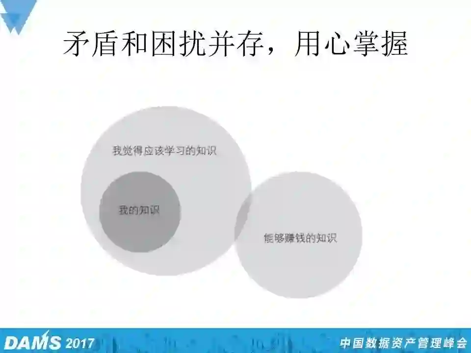 这个图是我看《大话数据结构》时候发现的,我们学了很多的知识,但是很多和能够赚钱的知识是有差别的,我们应该学习的知识很多,但是它和能够赚钱的知识之间是有一个交集,这一定需要一个积累的过程。