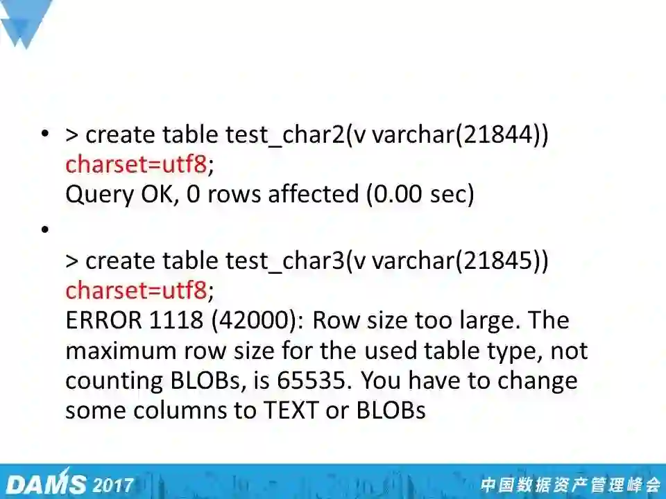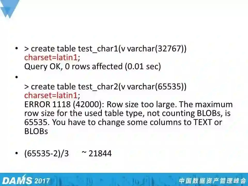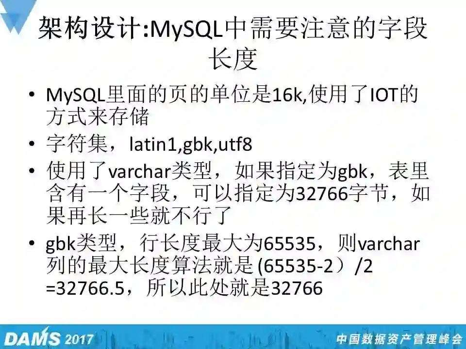 MySQL里面的页是16k,这个存储是用IOT的方式存储,字符集很丰富,有latin1,支持火星文,还有一些gbk还有utf8。如果你是gbk,表里含有一个字段,可以指定为32766字节,如果再长一些就不行了,gbk类型,行长度是最大为65535,则varchar列的最大长度算法就是(65535—2)/2等于32566.5。