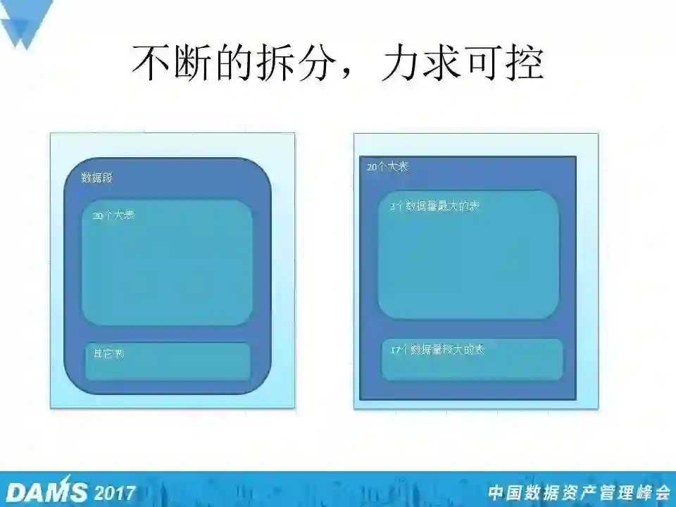 我们发现这个库里大概有20多个表是相对比较大的,一些其他的表是比较小的,基本上占到了90%的一个比例。对20个大表又做了一个基本的评估,我们发现这20个大表里面有3个表特别大,占到了整个数据量的90%。这几个大表虽然大,但是做查询比较多,基本没有写入,最后用OGG的方式去同步,占比很高的数据同步工作就做好了,而对于剩下的17个表,因为单表数据量也不大,就采用物化视图的prebuilt方式来创建,达到增量刷新的目的,当然如果用OGG同步也是可以的,里面有一些其他方面的考虑。所以这样的一个迁移,到了后期就逐步拆分,归类,最后的迁移只需要真正迁移5%的变化数据。所以说数据迁移没有最好的方案,只有最合适的方案。我讲了这么的案例,很多都是比较小的案例,看起来挺简单,数据类型都是比较小的案例,能够通过这些小的地方能够不断的去打磨自己。