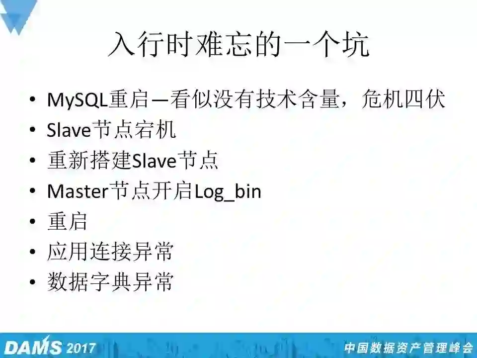 但是发现重启之后数据库起不来了,数据字典也有一些问题,这个也花了一点功夫修好,算是有惊无险。但是后面有一些应用的同学说数据库连不上,就查各种原因,一个看起来很简单的重启竟然带来了这么多的问题,最后排查发现有一部分应用连接之前就有问题,也是通过以前的日志去推理。所以一件很简单的事,最终引发出这么多的问题,这是我入行碰到的一个印象很深的问题,也是一个比较大的坑。