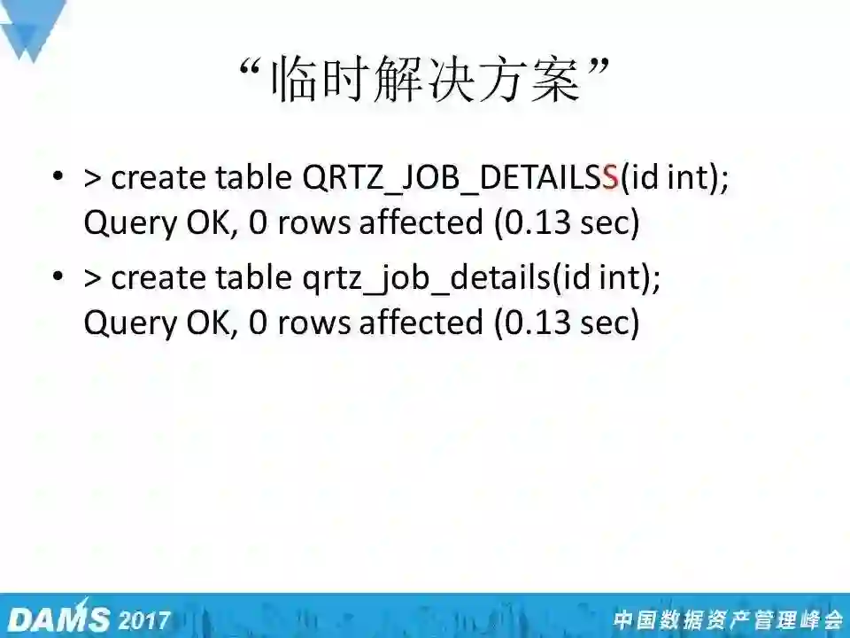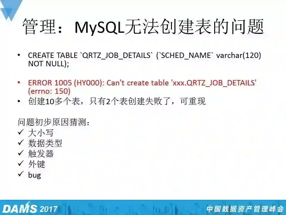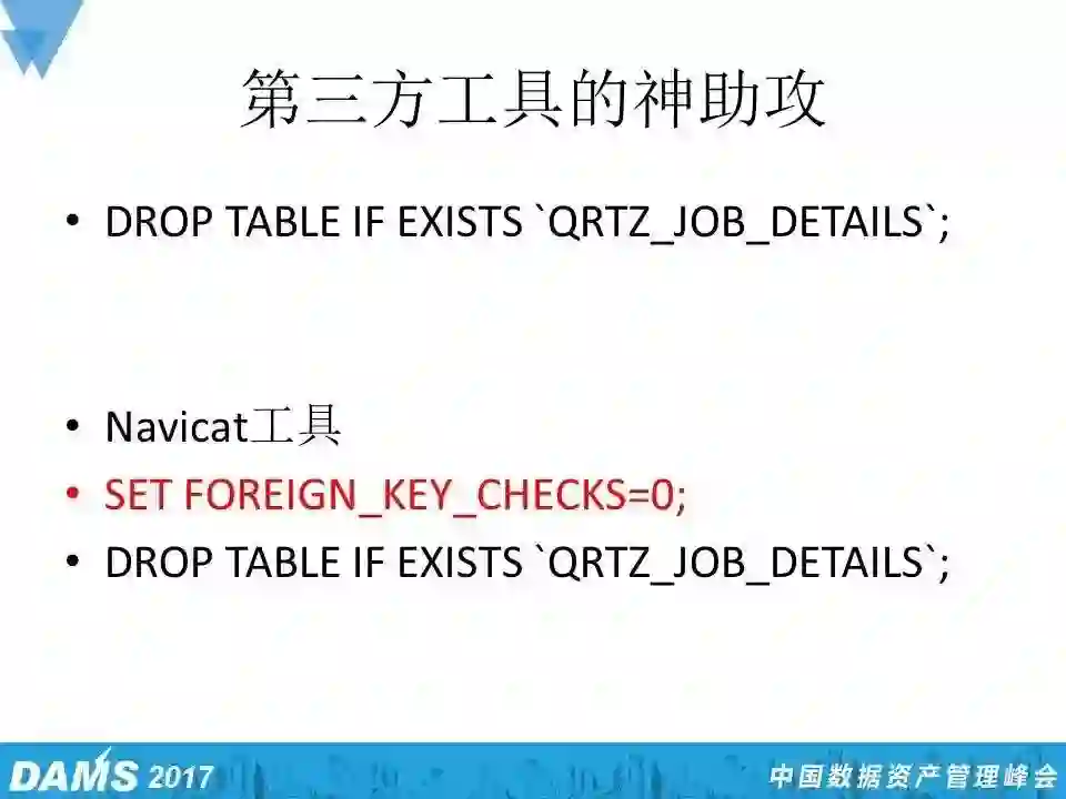 我们又做了一些排查分析,最后发现开发同学是用Navicat工具间接导致,这个工具可以做查询,比较方便。不是说这个工具不好,而是在变更前,这个工具默认会加这么一个选项,Setforeign_key_checks=0,这样外键的检查就不生效了,所以在部署脚本的时候,有两个表始终有问题。当然这个案例我们也做了总结,一个是第三方工具多多少少可能会有一些影响,需要评估。第二,开发同学提供这个脚本,当时提供的列表得不是很完整。比如说变更的表12个,他只提供了10个表的变更,他认为另外2个表已经有了就也不提供了,结果最后发现它们之间有一些关联,导致了一些问题。