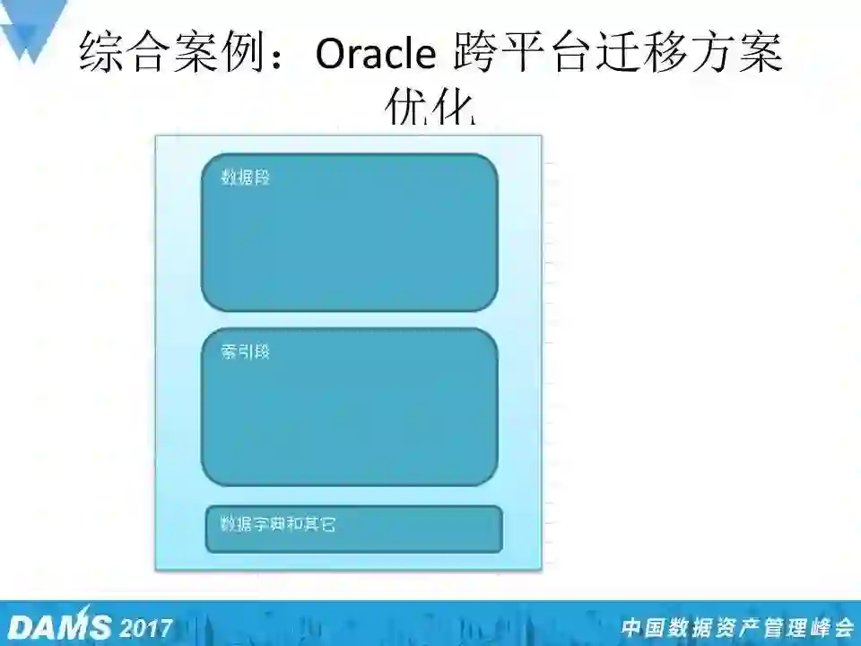 一个是数据管理,这个是基本功,一定要做好做深。架构设计方面,就是数据库架构师,要学会如何从应用设计需求去做一些工作,如果能把那个“库”字去掉就更好了。开发扩展,其实对DBA比较高的要求,不光有脚本开发能力,还有掌握开发语言。技术前瞻,可能你的技术目前没有问题,但如果从前瞻的角度来看,可能在几年之内会有什么样的发展和隐患。最后是综合能力,我会举一个Oracle迁移的例子,告诉大家怎样去做一个迁移的优化。