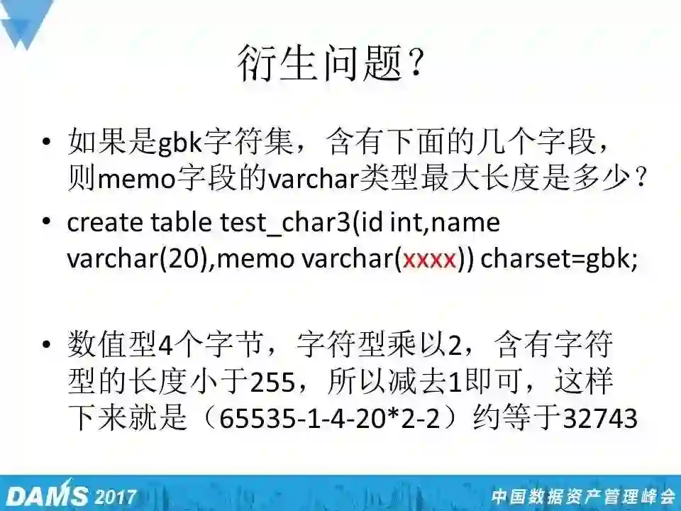 如果是gbk字符集,含有下面的几个字段,则memo字段是varchar类型最大长度是多少,这是一个很常规的问题,如果把这些连接起来去演算一下,数值型是4个字节,字符型乘以2,含有字符型的长度小于255,所以减去1即可,这样下来就是32743。