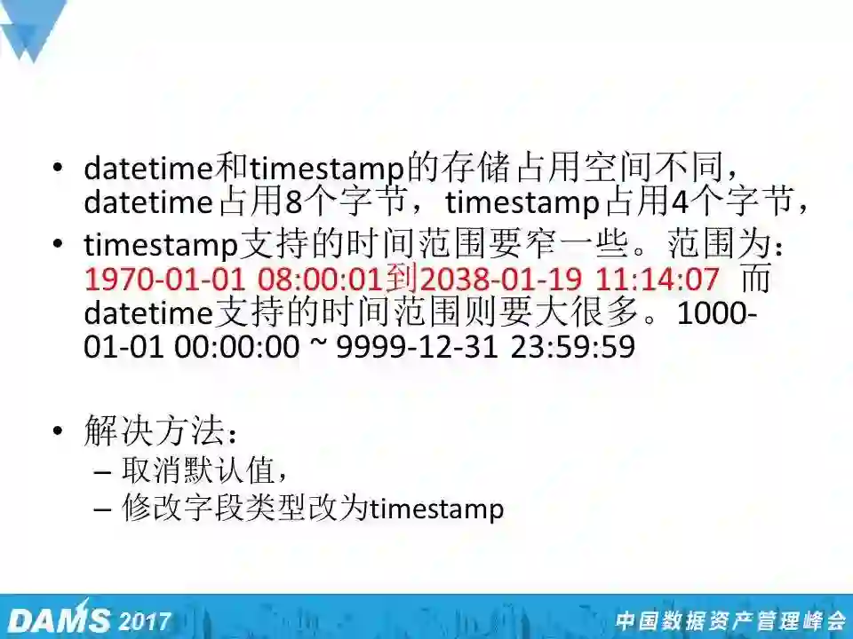 大家如果观察得比较仔细,会发现这个数据类型是datetime和timestamp都是时间字节,datetime是8个字节,timestamp是4个字节,大家去设计的时候也要去考虑。这个问题的解决简单总结一下,一个是对于版本为了保持兼容,那我就不需要加默认值了,第二个对这个问题做了一个权衡之后,他们觉得用timestamp目前可以解决我碰到的问题。