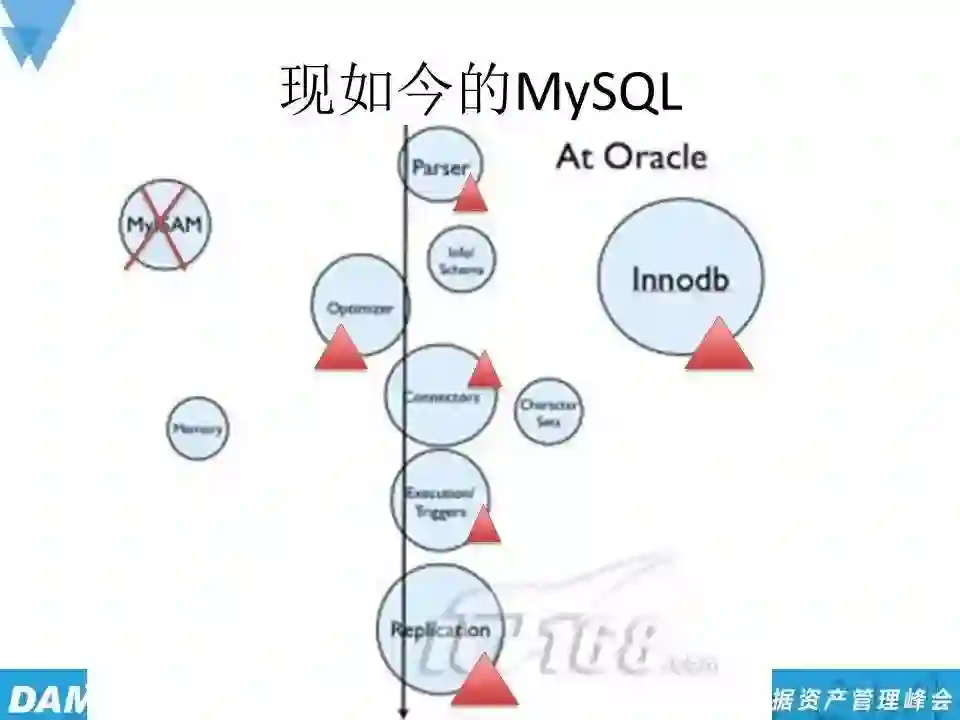 而MySQL被Oracle收购后的发展大体是这样的一个比例,右边的开发人员是Oracle公司的,左边的则是原来的MySQL团队的。