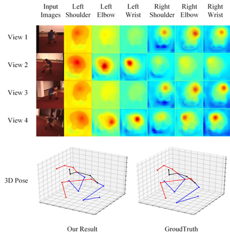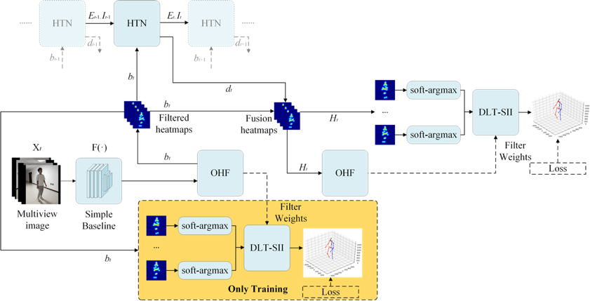 从时间同步的、经过校准的多视角视频中估计三维人体姿态通常包括两个步骤:(1)通过每一帧的热力图定位关节的二维坐标点位置;(2)使用迭代空间划分模型(3DPS)或三角化方法(Triangulation)等后处理方法获得三维坐标点。然而,大多数现有的方法只基于单帧。它们没有利用视频序列本身的时间特征,必须依赖后处理算法。还容易受到人的自遮挡影响,而且生成的序列存在着明显的抖动。
