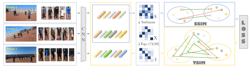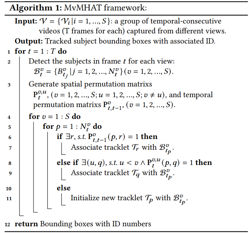 本文提出了一个自监督学习网络框架来解决MvMHAT问题。具体地说,给定几个不同视角多人场景视频,我们首先对来自不同视角和时间的帧进行采样,并应用卷积神经网络(CNN)来提取每个行人的深度特征。在训练阶段,如图2所示,我们提出了一个时空关联网络来模拟跨时间关联和跨视角关联,该网络构造了一个相似度匹配矩阵,并且可以通过对称相似(SSIM)和传递相似 (TSIM)损失作为损失函数进行自监督训练。在推理阶段,如算法1所示,我们采用一种新的时空关联跟踪联合优化方法来解决MvMHAT任务。